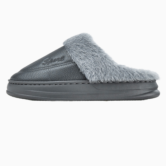 Leather Slippers for Men with Faux Fur Collar